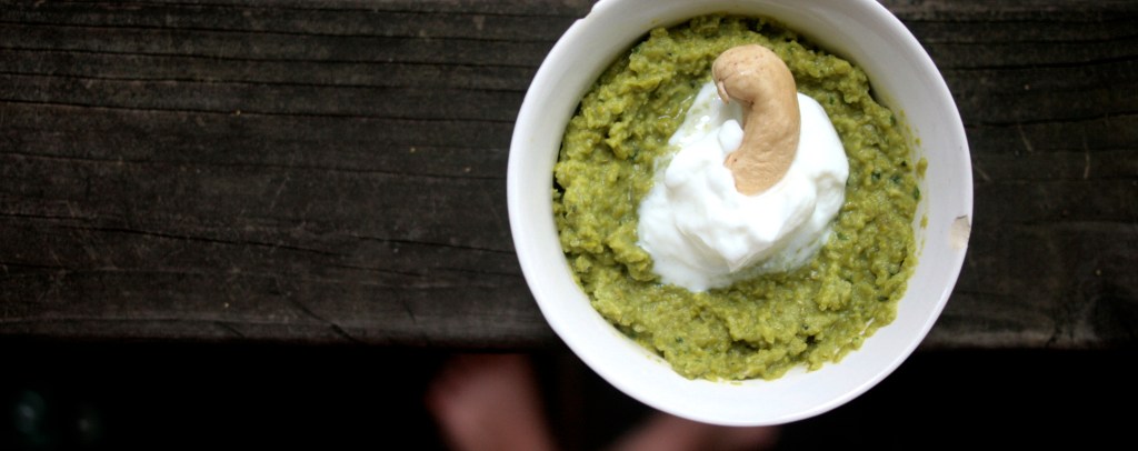 Roasted potatoes and green beans smothered in mint pesto straight from our front yard