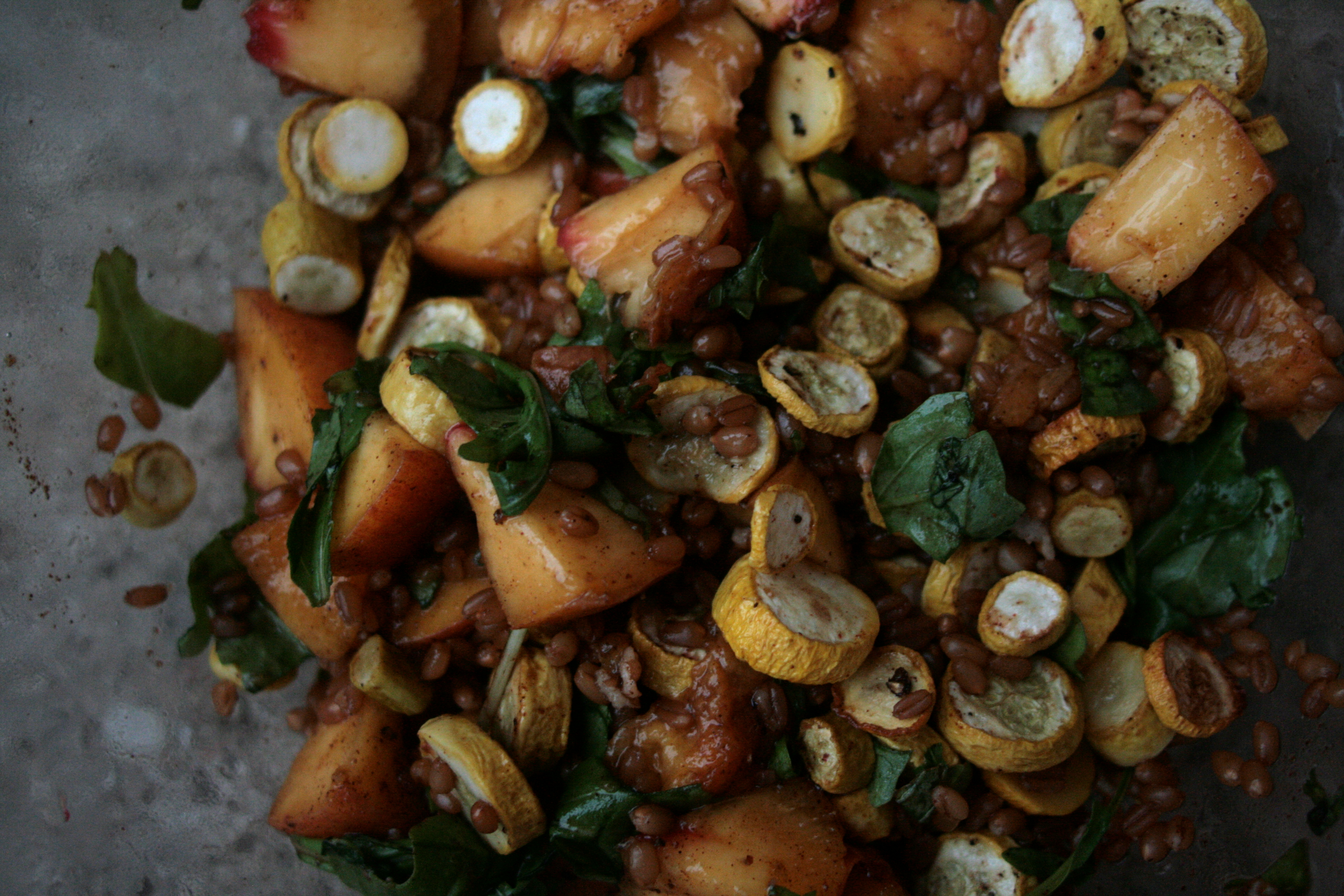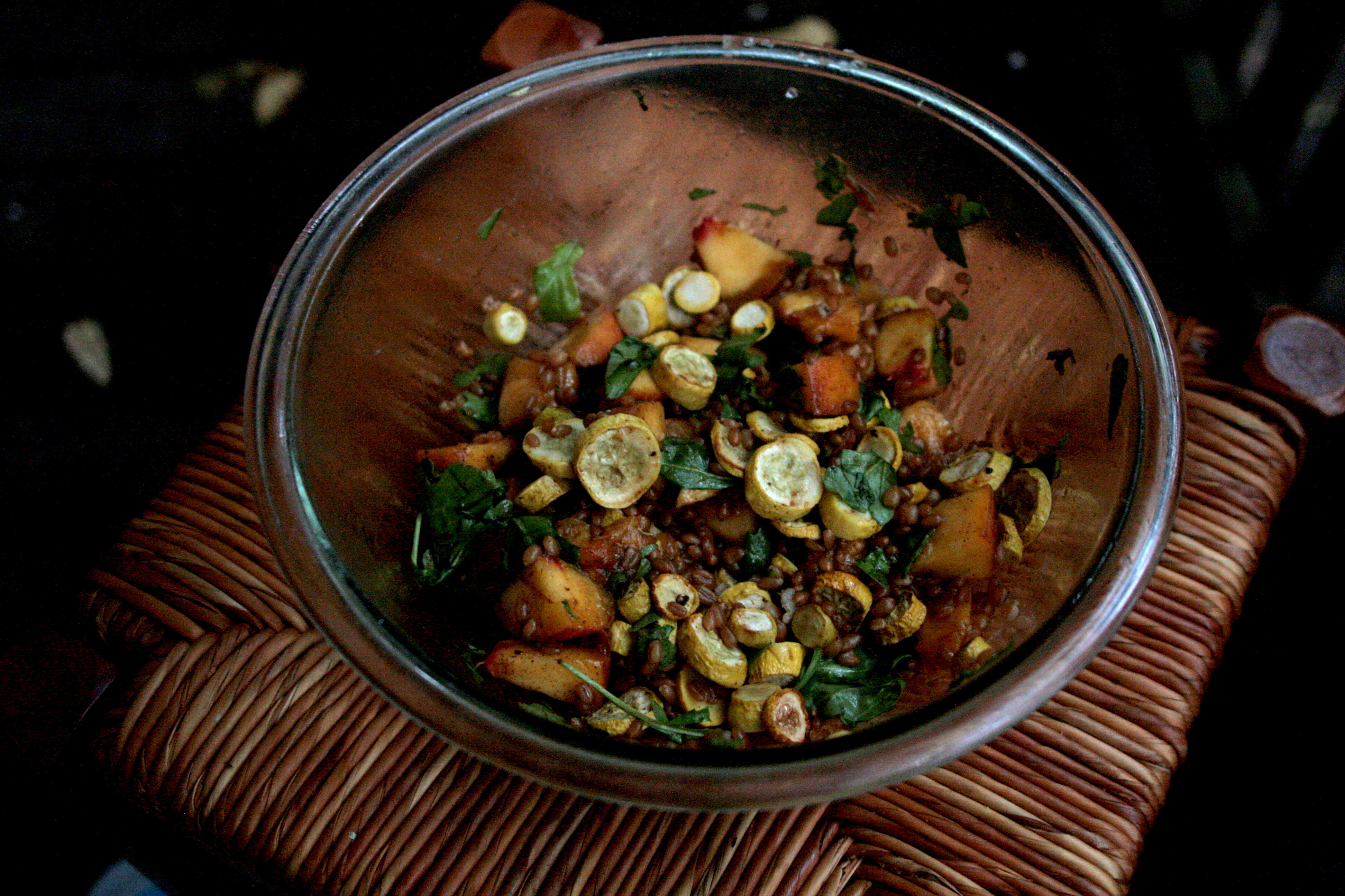 Create mixture of balsamic vinegar and honey (and go ahead, add another dash of chipotle!). Cut peaches/apricots into chunks. Chop basil into ribbons. Soak basil and peaches/apricots in balsamic/honey mix until remaining ingredients are ready. When squash is crisp and wheat berries are chewable, let cool and mix with peaches and basil. Enjoy cold/hot/over a bed of spicy arugula.