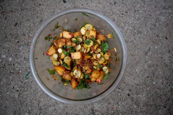 I think my favorite thing was the Wheat Berry salad. I was attempting to make a barley salad, but all of our grains and flours are in unlabeled jars. I grabbed one that looked like barley, added water and salt, and then I had wheat berries. Hardy wheat berries + tangy vinegar + basil + sweet apricots + spicy chipotle squash = incredible. I’m obsessed with chipotle. Lately, I’ve been putting peaches and chipotle in all my salads.