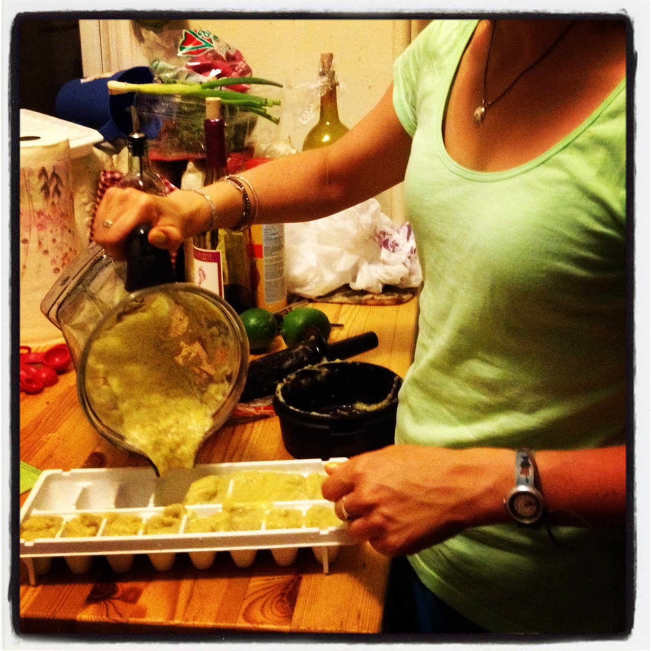 Puree all ingredients in food processor and pour puree into ice tray. Plop into bloody marys.