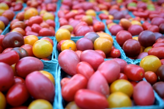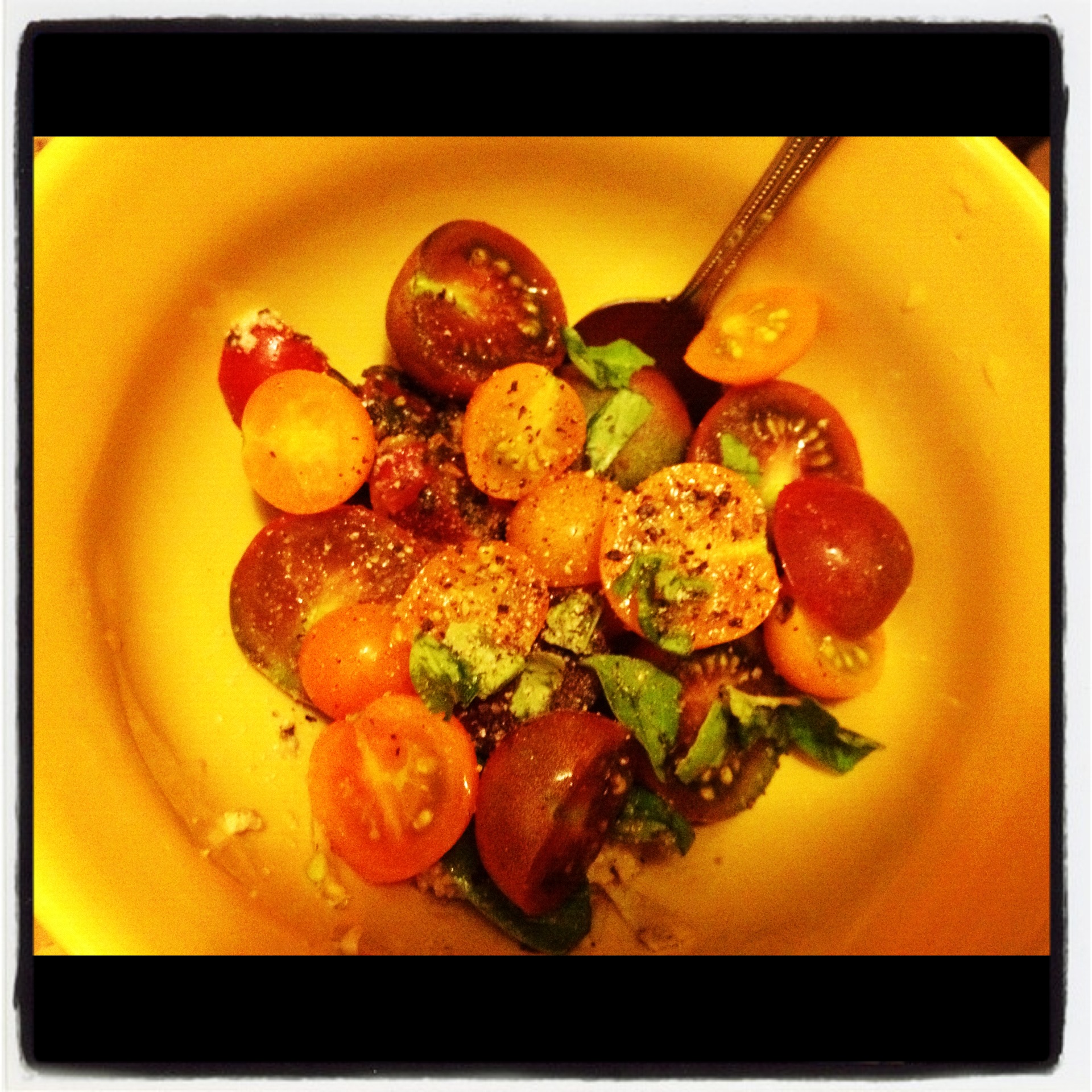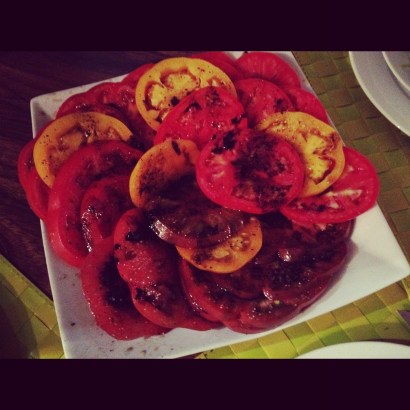 Slice fresh tomatoes (any varieties) about a 1/4 inch thick and arrange on a platter. Sprinkle with sea salt and freshly cracked pepper.