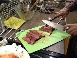 David, the owner, happened to be marinating a piece of flat iron steak in our refrigerator (so he had to invite us to share dinner with him and Doug). After poking holes in it with a fork and rubbing it with a variety of herbs, spices and marinades, he left it uncovered in the refrigerator for two days and only had me turn it once.