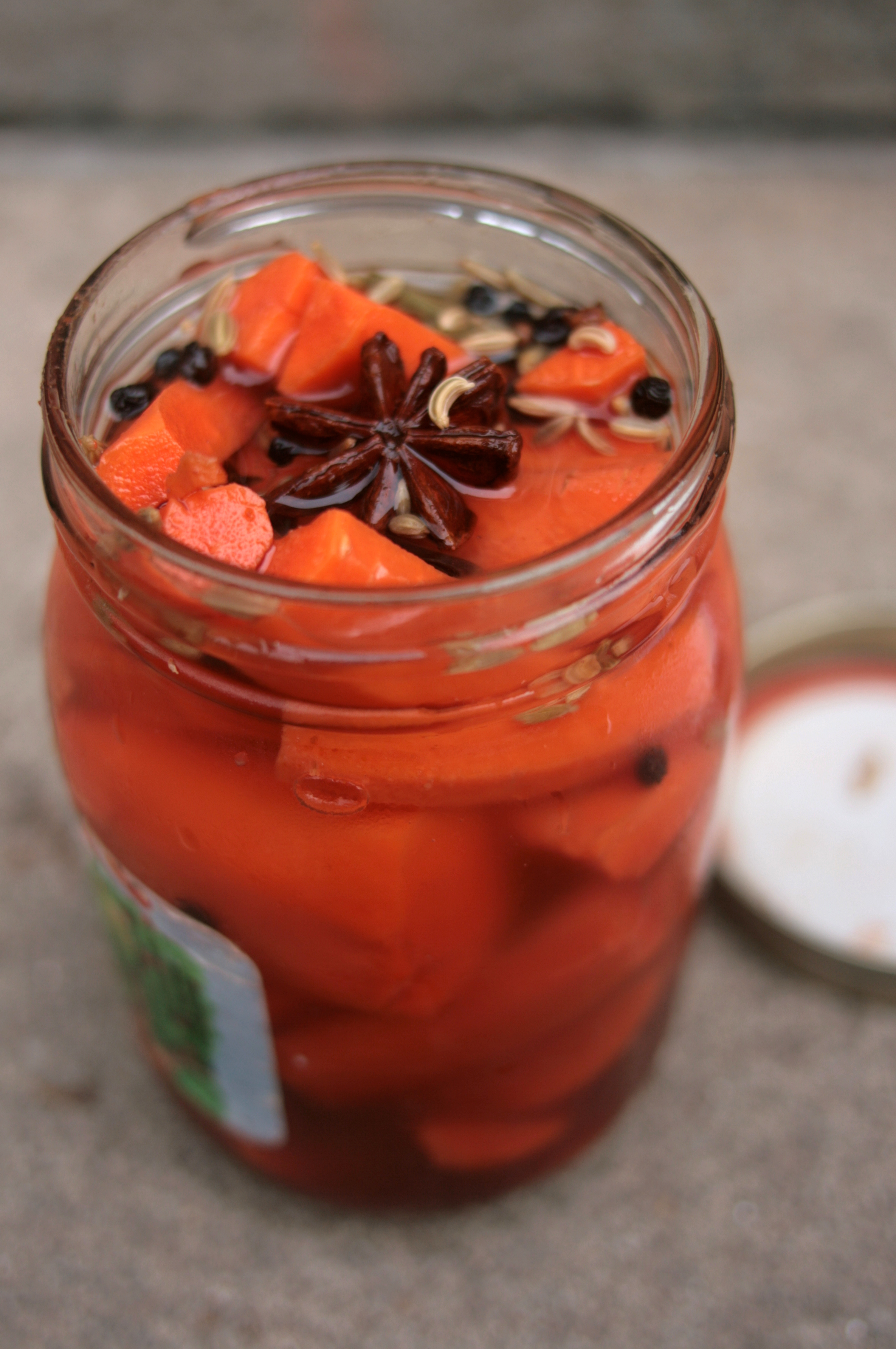Peel and cut carrots to desired size. Mix vinegar with spices in a pickling jar such as a Mason or old jam jar. Blanch carrots (drop in almost boiling water for less than a minute) before soaking them in pickling mixture. The longer they sit, they better – shortest soaking time should be overnight.