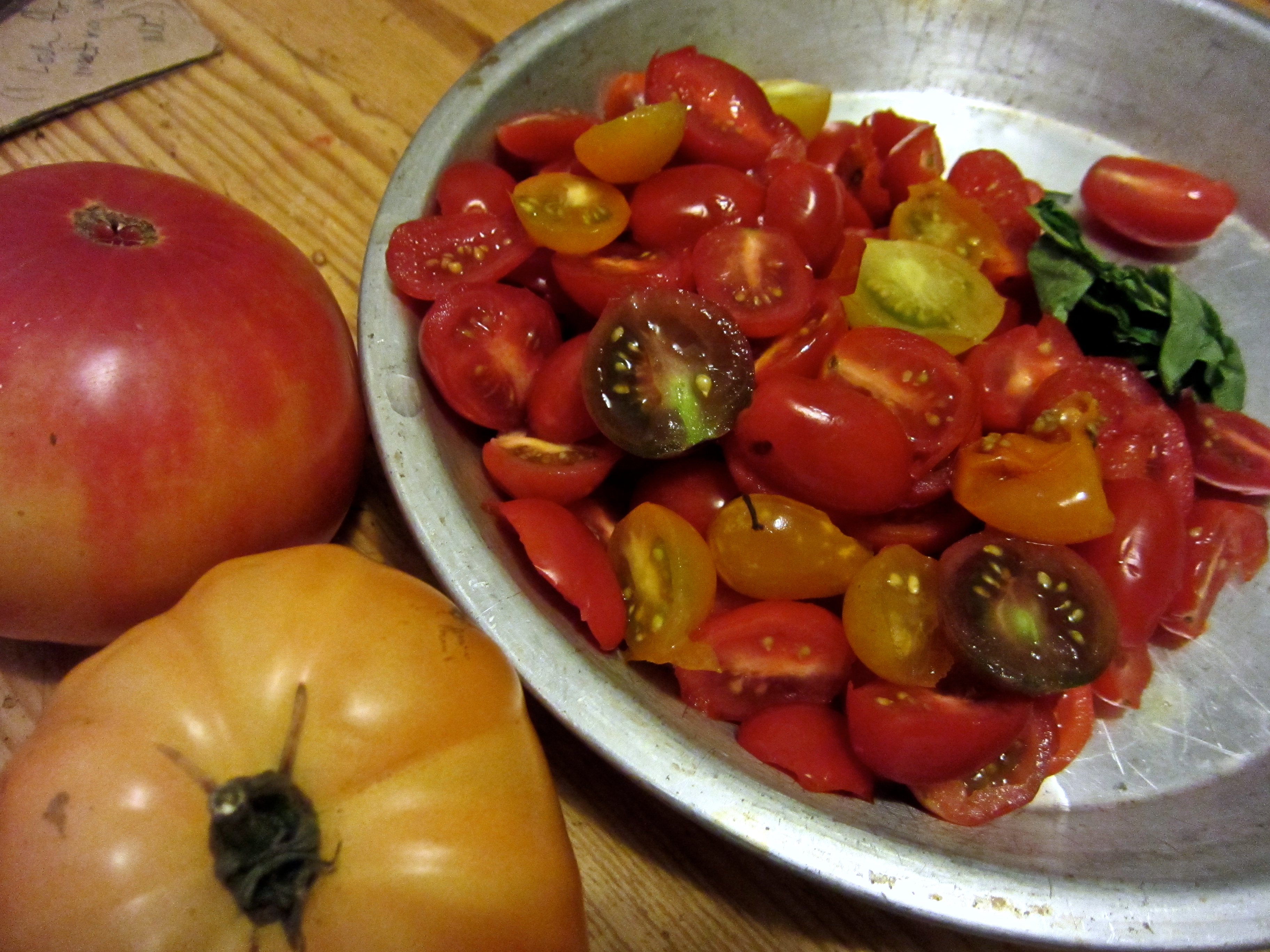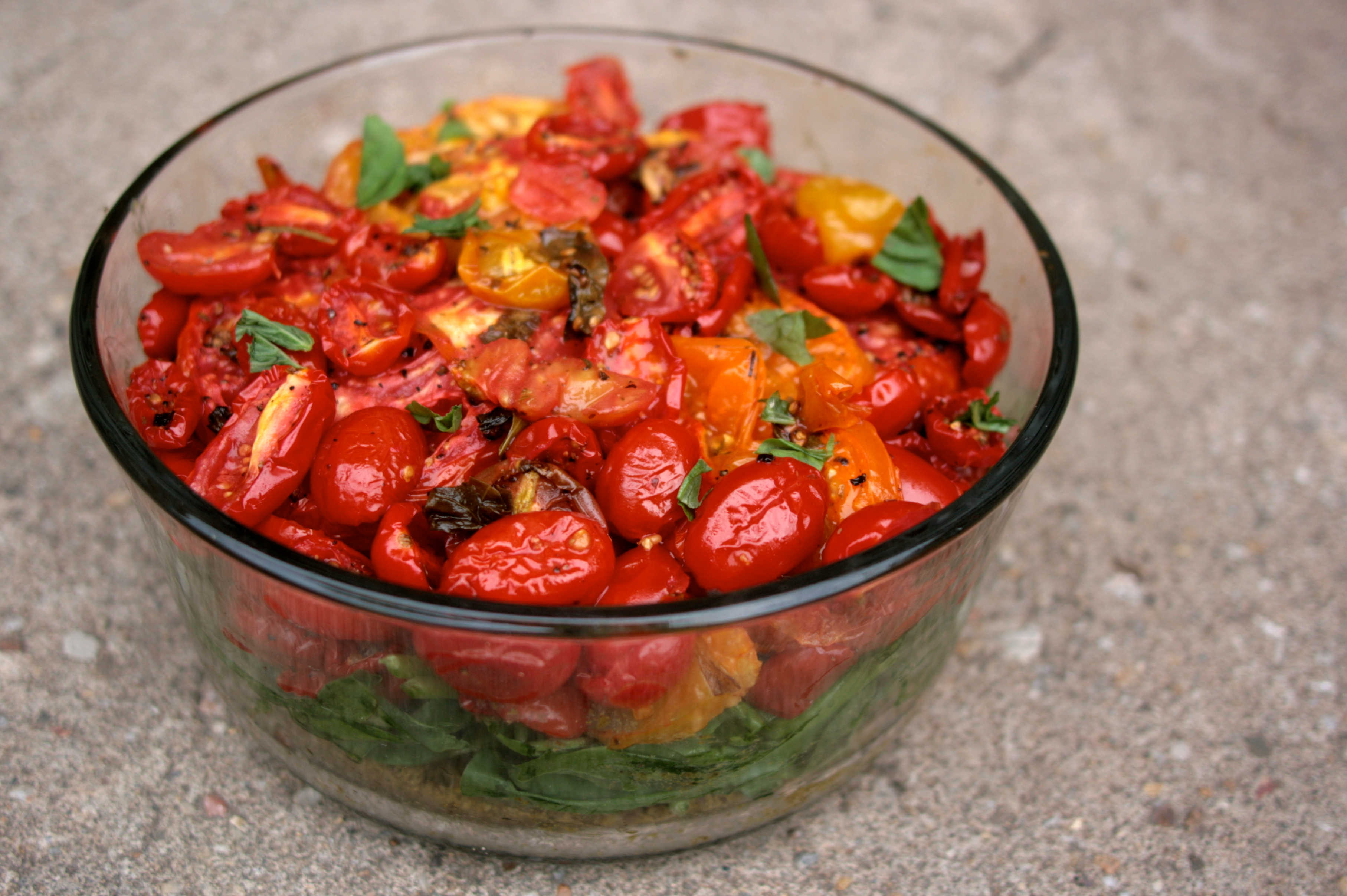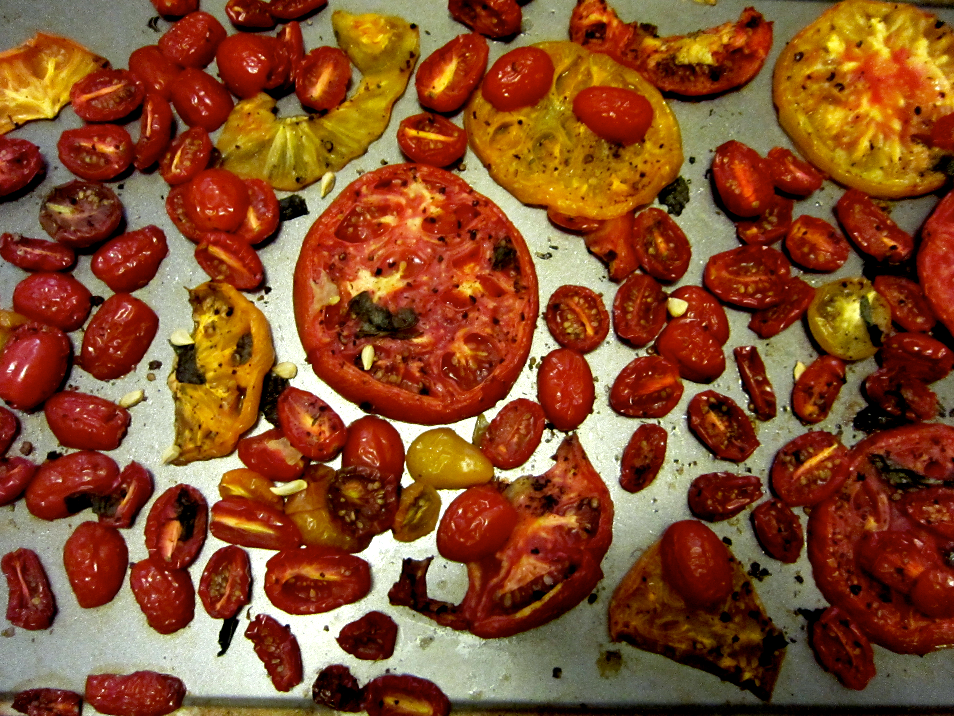 Cut tomatoes in thin slices and coat with lemon, olive oil, salt, pepper and fresh basil. Dehydrate in an oven at 100 degrees. I turned my oven on at the “warm” setting, put the tomatoes in for 30 minutes, and then turned the oven off and let the tomatoes sit in the remaining warmth overnight. In the morning, I turned the oven to the “warm” setting again and let the tomatoes warm for 15 minutes.