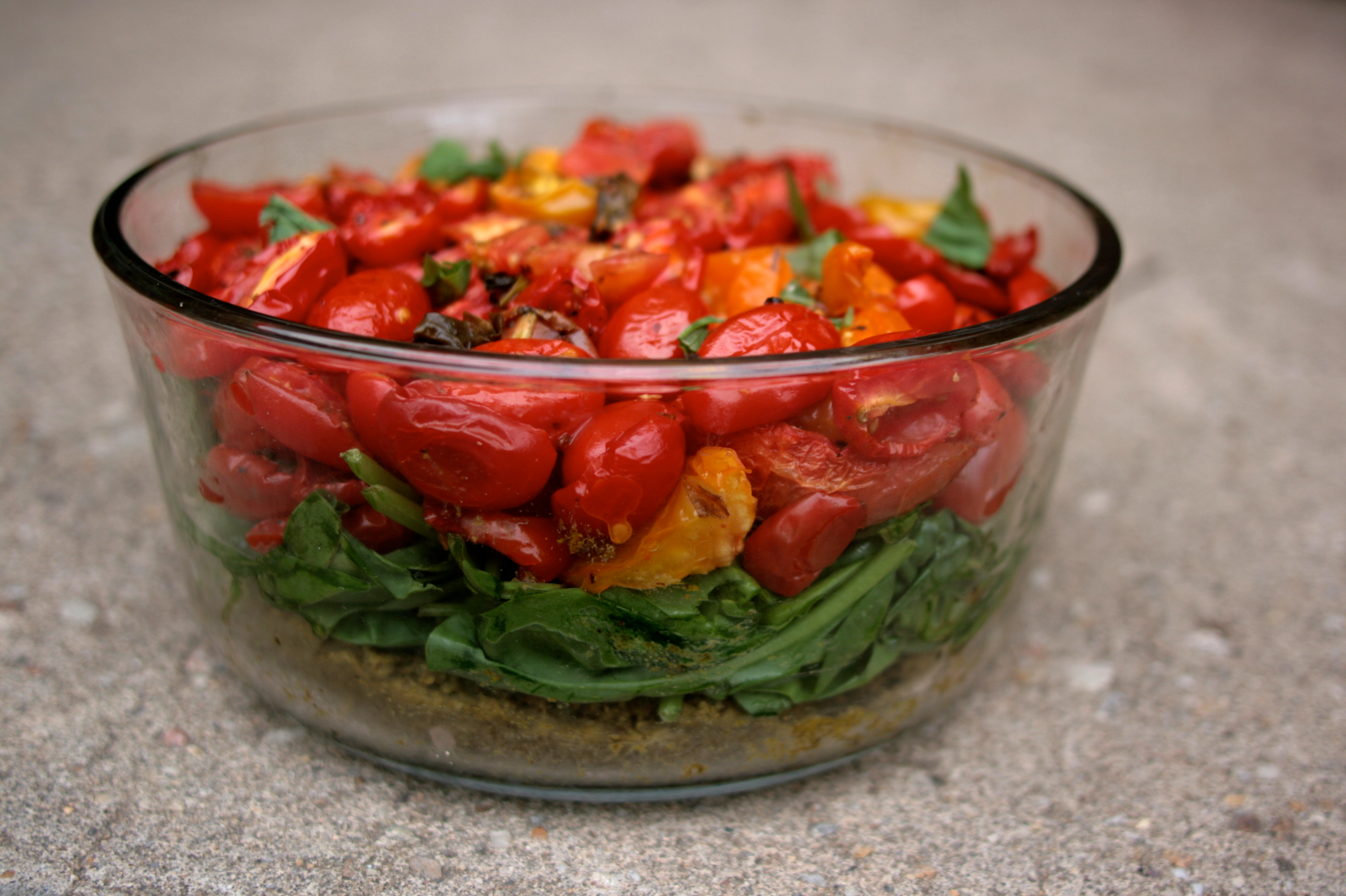 I went to three separate farmers markets over the weekend to collect a diverse arrangement of tomatoes. I dehydrated them to sweet, tangy perfection. There is nothing better than the concentrated sweet, lemony tartness of dehydrated heirloom tomatoes. I layered the tomatoes with spinach in a comforting tart served alongside a creamy avocado salad and spicy pickled carrots. The avocado salad included red lettuce, avocado, pickled grapes (they taste like charozet!), slivered almonds and a honey-tahini vinaigrette. The plate of spicy, creamy, tartness won the crowd. And I love to win.