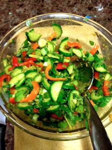 I am also trying to get a little prepared for the holidays and starting to think about menus. Since we’re going on the “cleanse” right after Rosh Hashana, I want to make some things that we can eat after our holiday meal. I am thinking veggie chop liver (are eggs okay on the cleanse?), kasha with mushrooms and onions and a new Indian cucumber salad recipe. Of course, I am going to make some of the traditional stuff also…Bubbe’s potato knishes, and maybe a kugel or two, and some apple crisp, of course. Any requests? I’ ll send holiday recipes next time, when I figure out what I am doing.