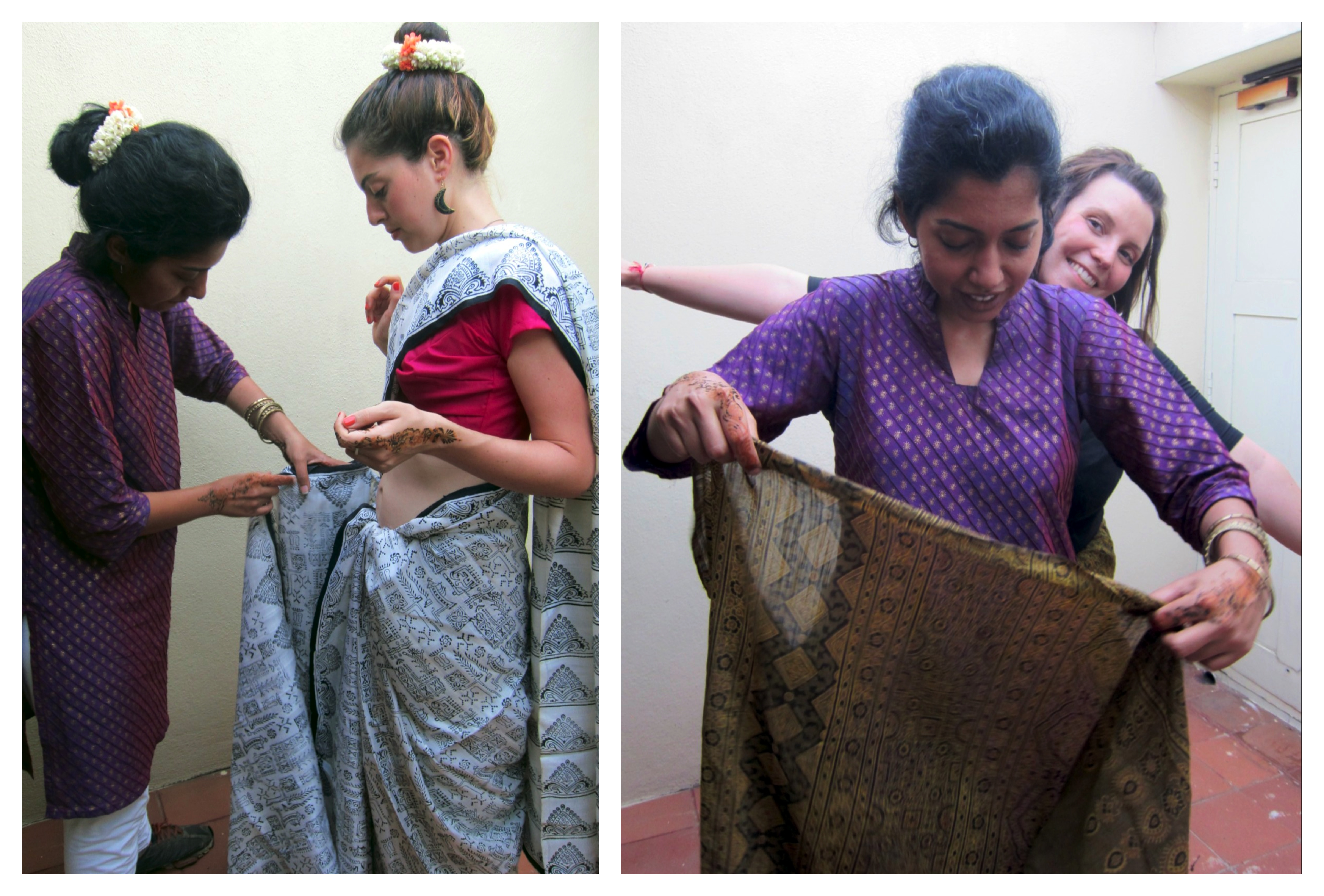 I borrowed saris from the master of sari beauty and elegance, Shruthi. The one above was printed by Ismael Khatri’s operation in Ajrakpur. Also, Shruthi has an amazing blog about Kutch.