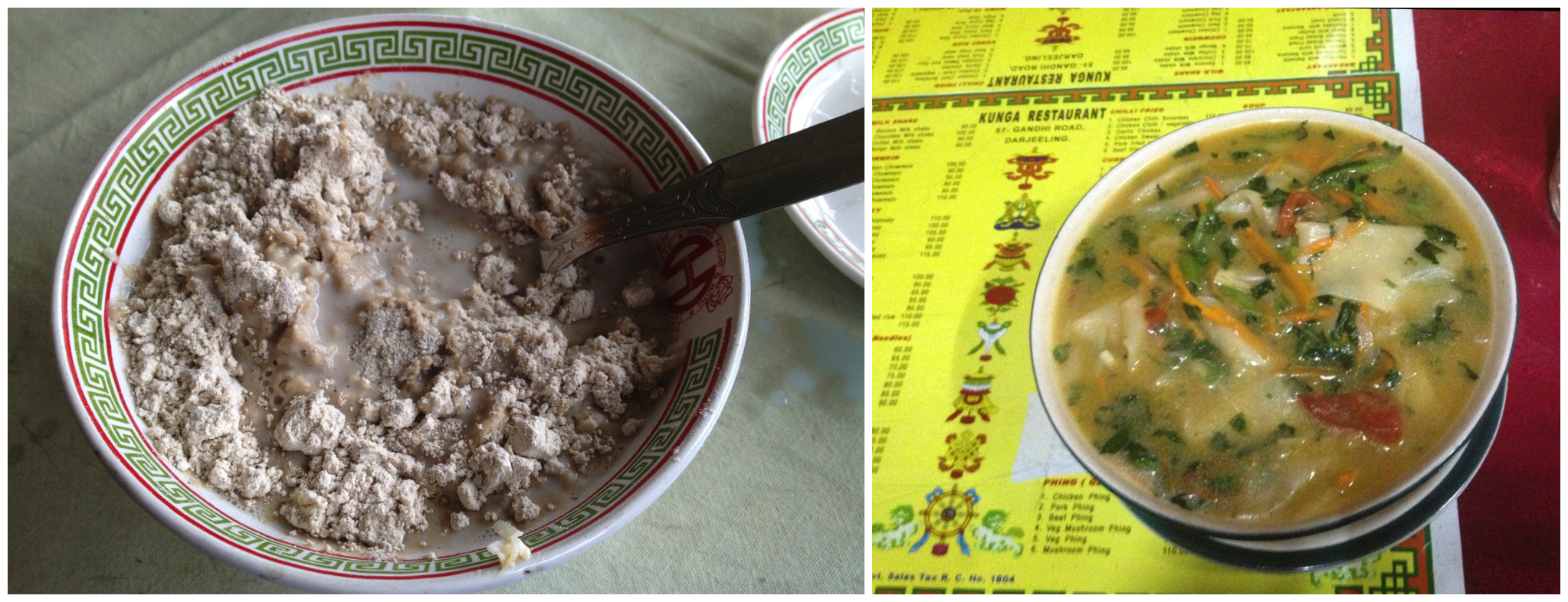 Tibetan food in Darjeeling. Tsampa (roasted barley flour porridge) with cheese and milk for breakfast and Thupka (noodle soup) for dinner.