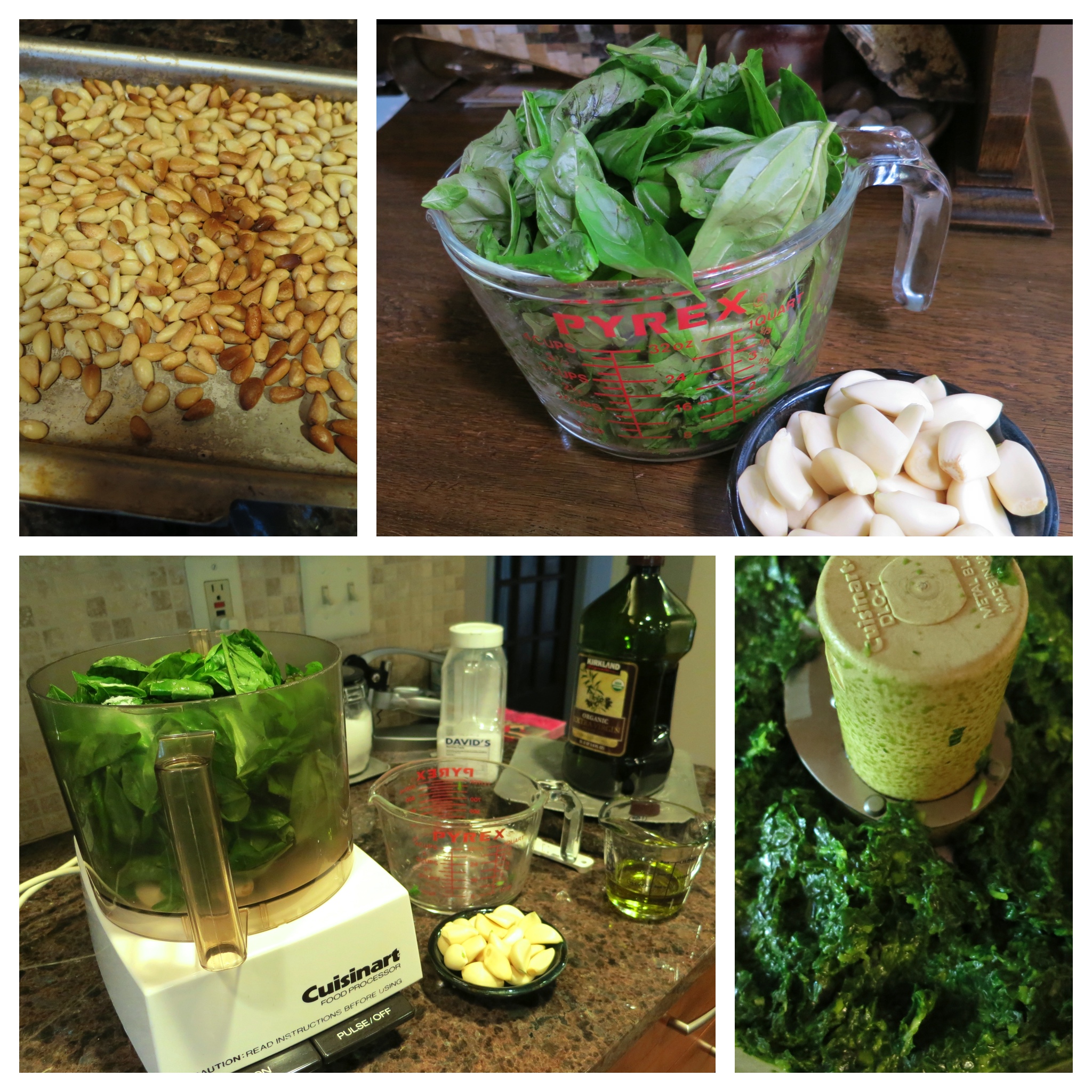 If you like to add nuts to your pesto, roast 1/3 -1/2 cup of pine nuts or walnuts and add them to the processor with the other ingredients and process.