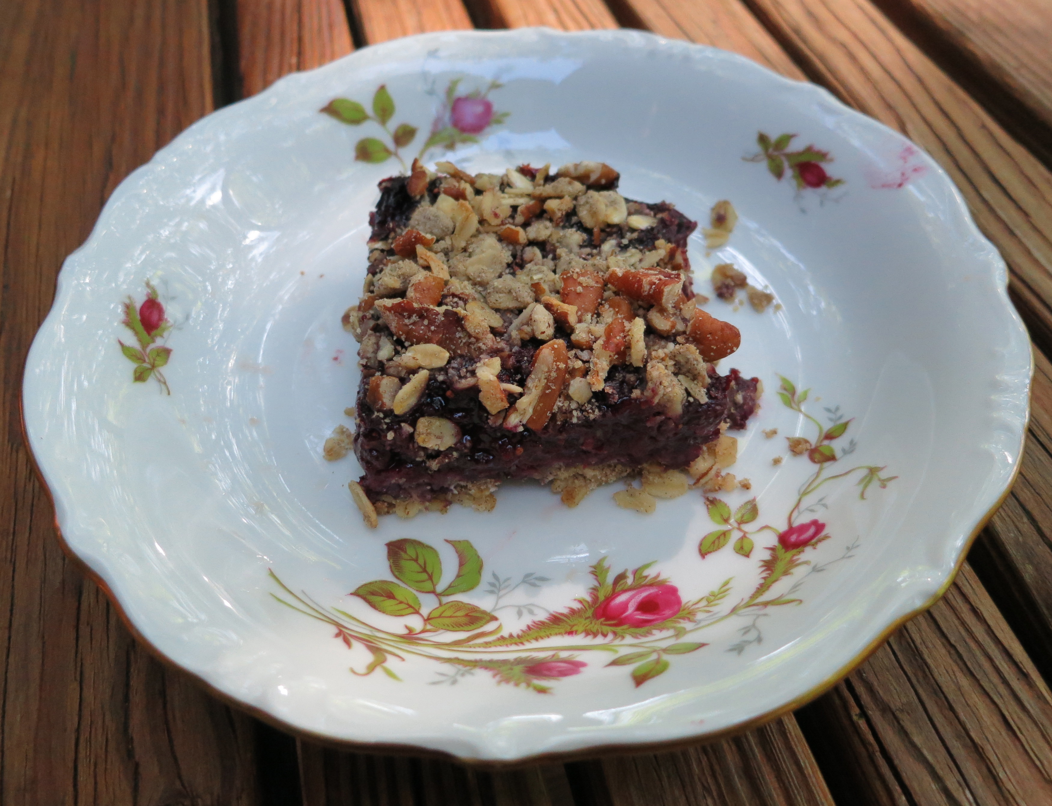 Bake at 350° for 35 – 45 minutes or until oats and nuts are lightly browned and blueberries are bubbling.Pour the slightly cooled blueberry filling over the crust in the baking dish. Sprinkle the oat-nut topping mixture evenly over the berries.