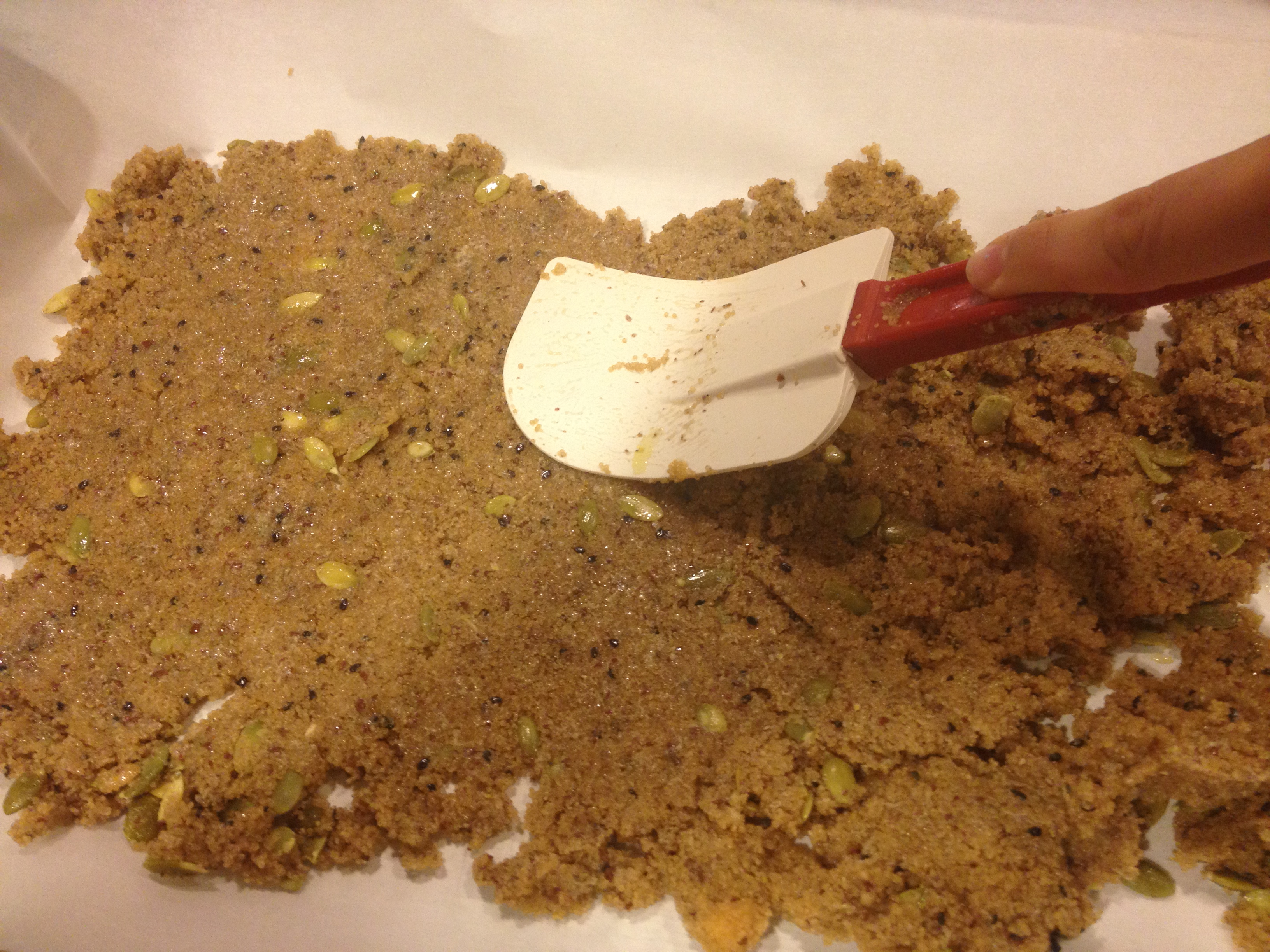 Cook amaranth (bring one part amaranth to two parts water to boil and then reduce to simmer… it takes about 20 minutes). It should be a sticky, gooey consistency… like thick oatmeal. Mix cooked amaranth with remaining ingredients. Line two cookie sheets with parchment paper and spread amaranth mixture into thin layers, using the back of a spatula to even it out (I covered the back of my spatula with olive oil so it wouldn’t stick to the amaranth mixture).