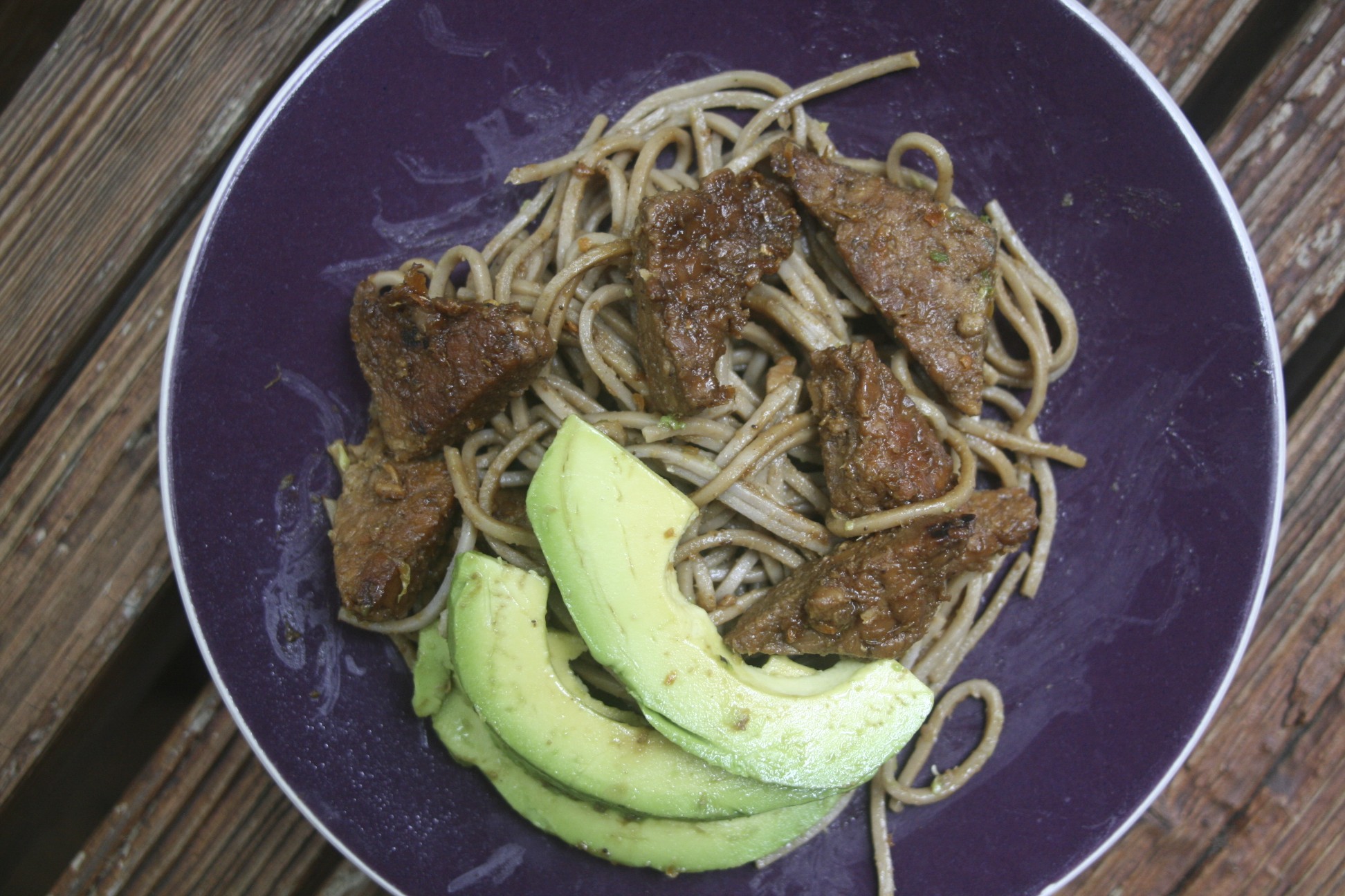 Orange Glazed Tempeh over Soba Noodles with Avocado: