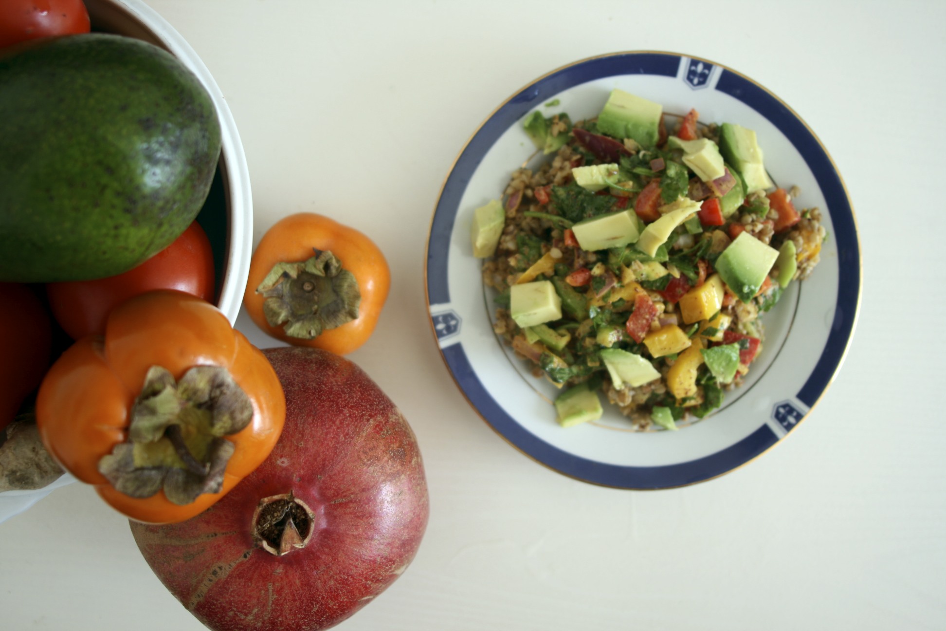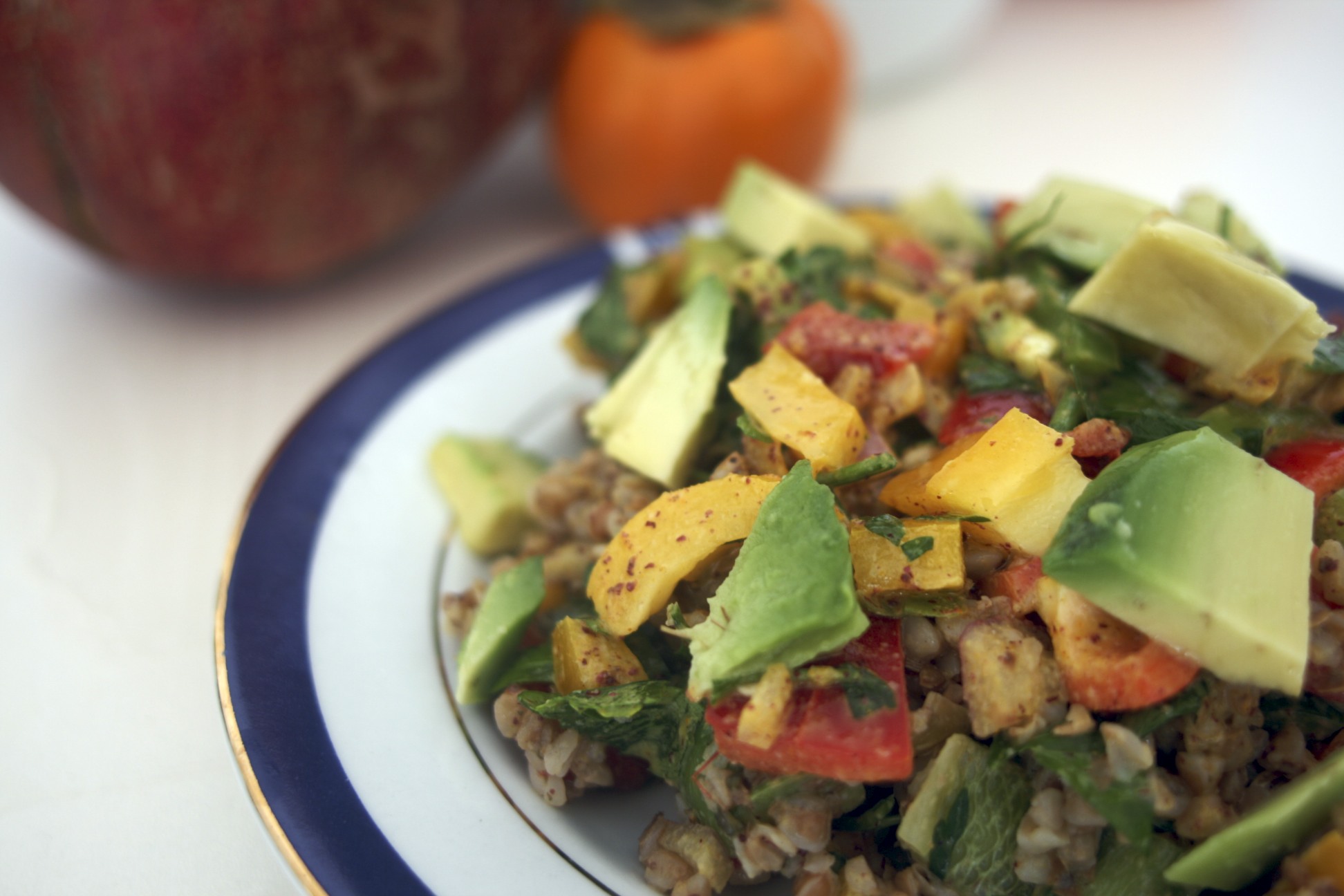 Toss buckwheat, veggies and dressing right before serving. Top with chopped parsley and avocado. Serve cool or room temperature.