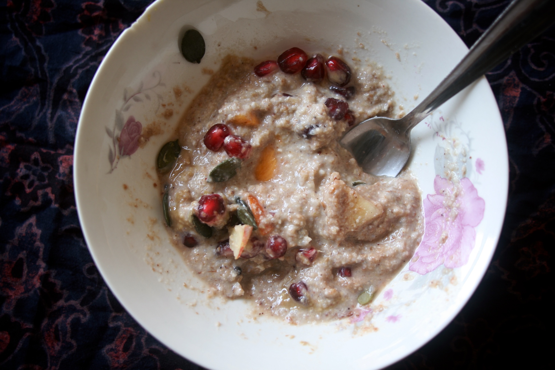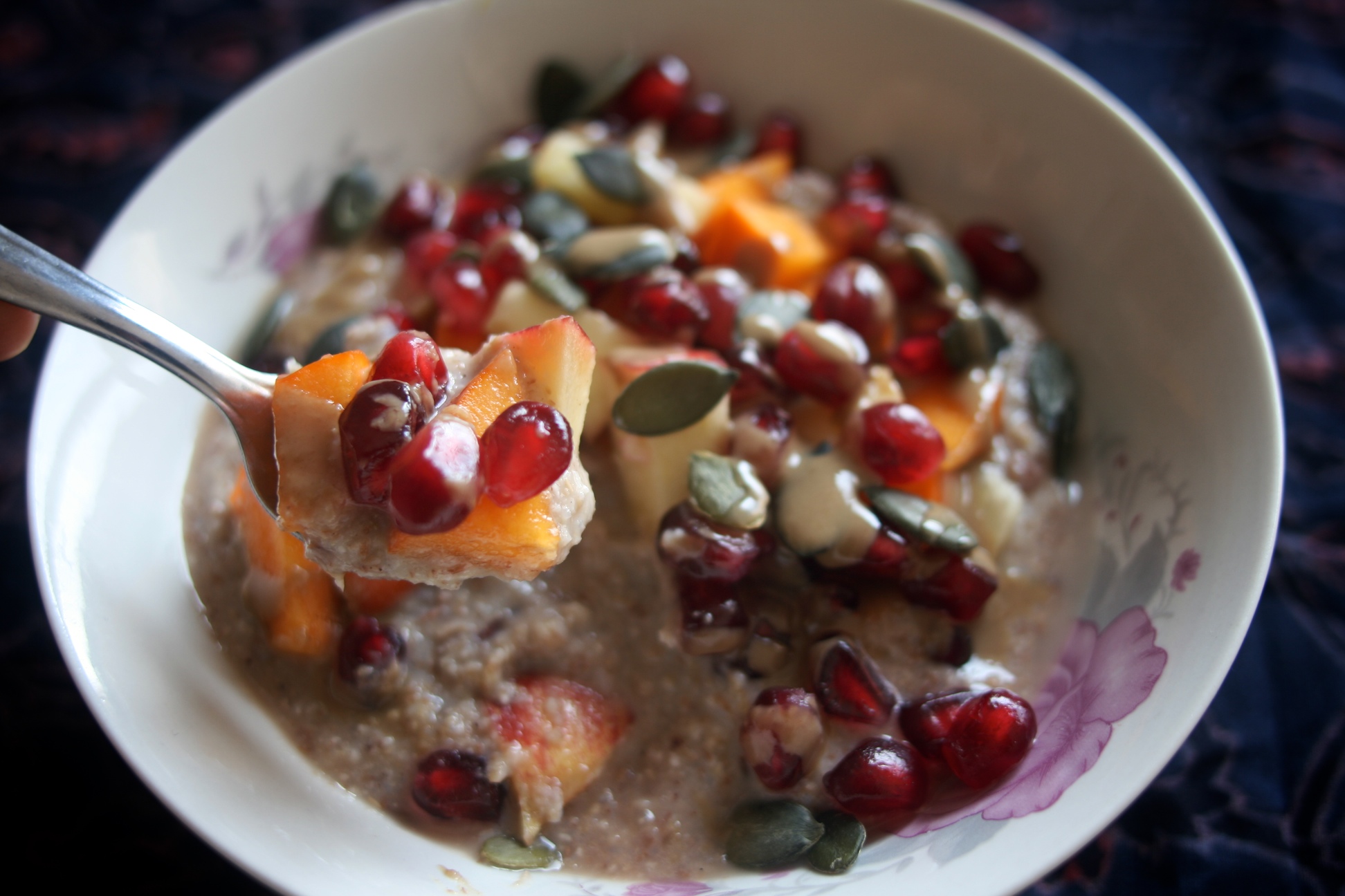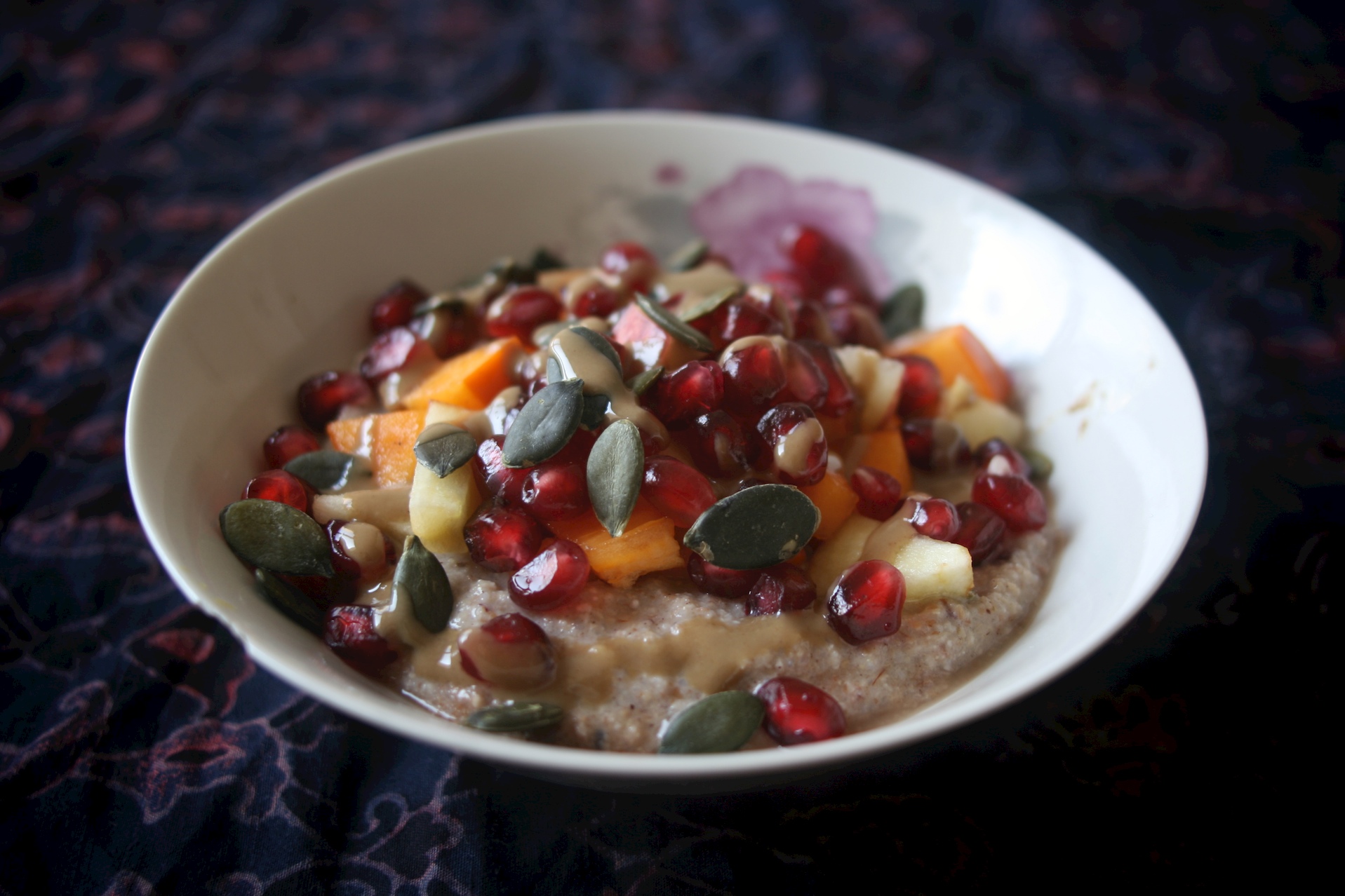 Topping treats! I garnished my first serving with pomegranate seeds, chopped apples and persimmons, pumpkin seeds and drizzles of tahini and date syrup. It was luxurious. I also recommend any fresh fruit you have on hand, raisins, cocoa powder, date syrup, coconut flakes, honey, almond butter or your own favorite indulgences.