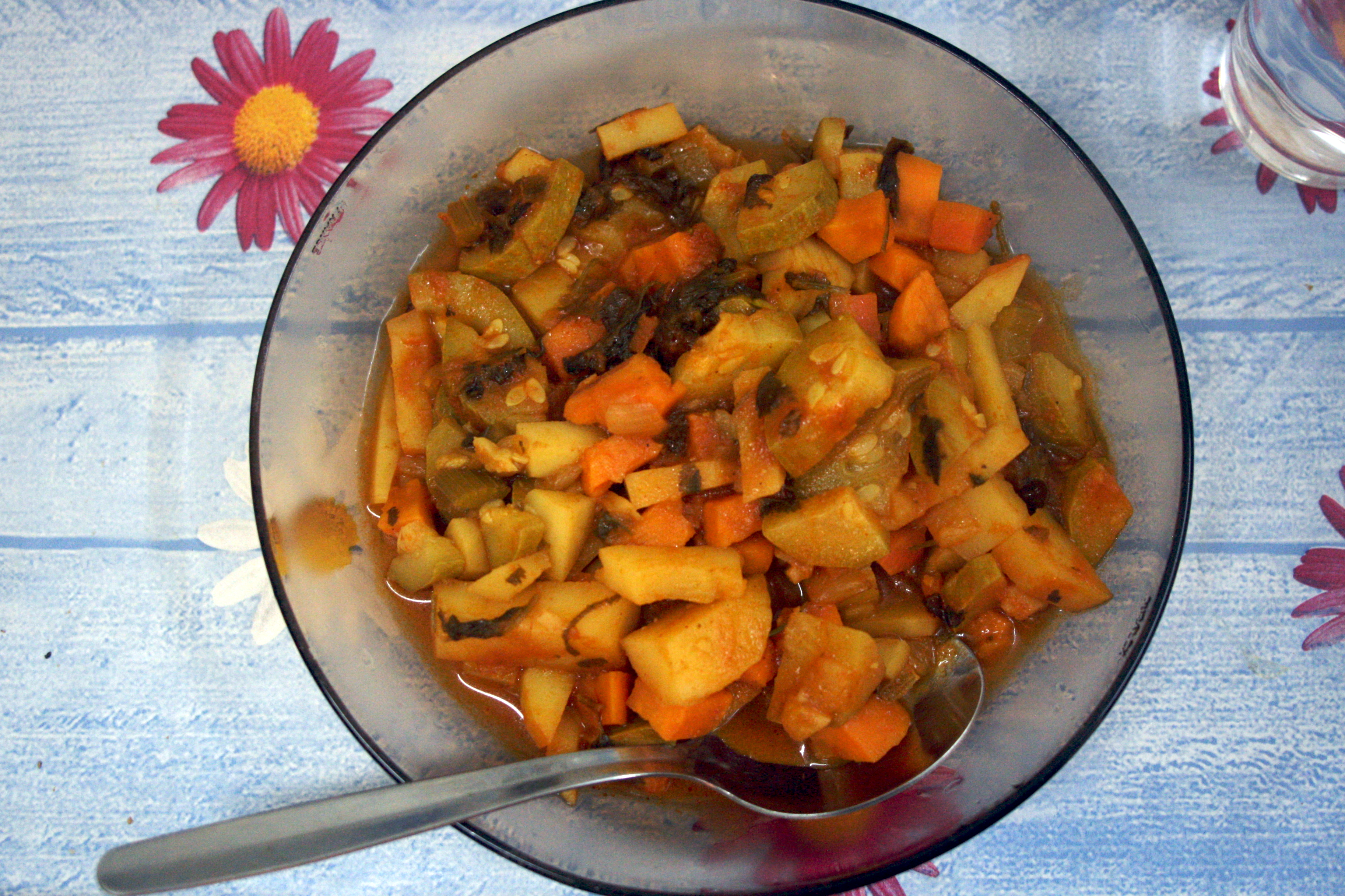 Saute onions and carrots of medium heat until onions are translucent. Add one cup of water and remaining vegetables. Bring to boil and simmer for 10 minutes. When carrots are soft add tomato paste and spices. Stir, cover pot and simmer for 10 minutes. Add coriander and allow to cook for five more minutes. When vegetables are soft, serve piping hot with bread or rice.