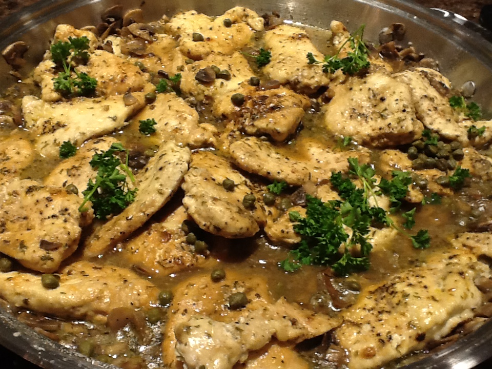 Cook until chicken is browned and cooked through and all flavors are well-blended. This could take 20 – 40 minutes depending on how much chicken is in the pan. Toss in capers. Serve immediately or keep warm until serving time.