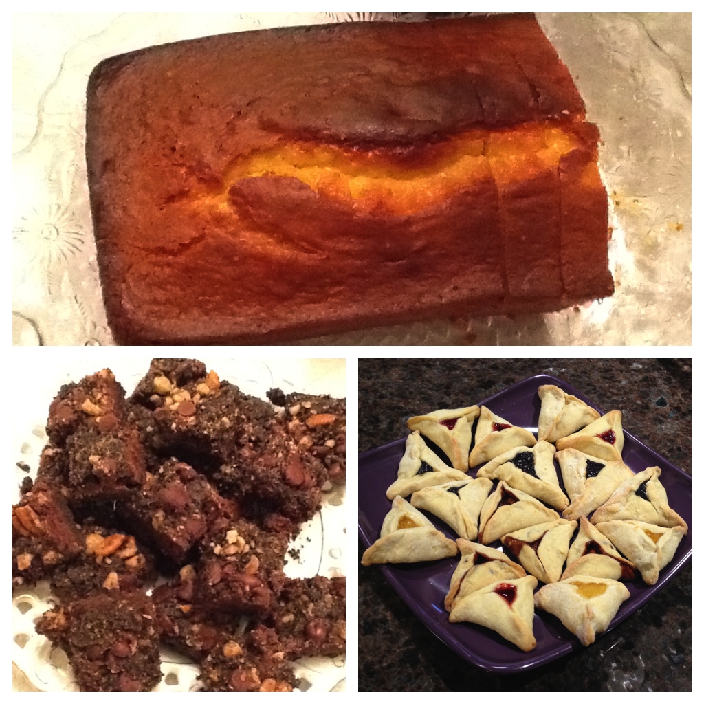 I made hummus with the tahini I brought home from Israel, your zesty herbed rice salad with dried cut-up figs instead of raisins, roasted green beans and chicken piccata with mushrooms and capers. Dessert was lemon pound cake, cherry hamantaschen (still some in the freezer waiting for you), and Naomi’s famous chocolate streusel bars. It was the perfect collaborative feast and a very special Shabbat for all of us!