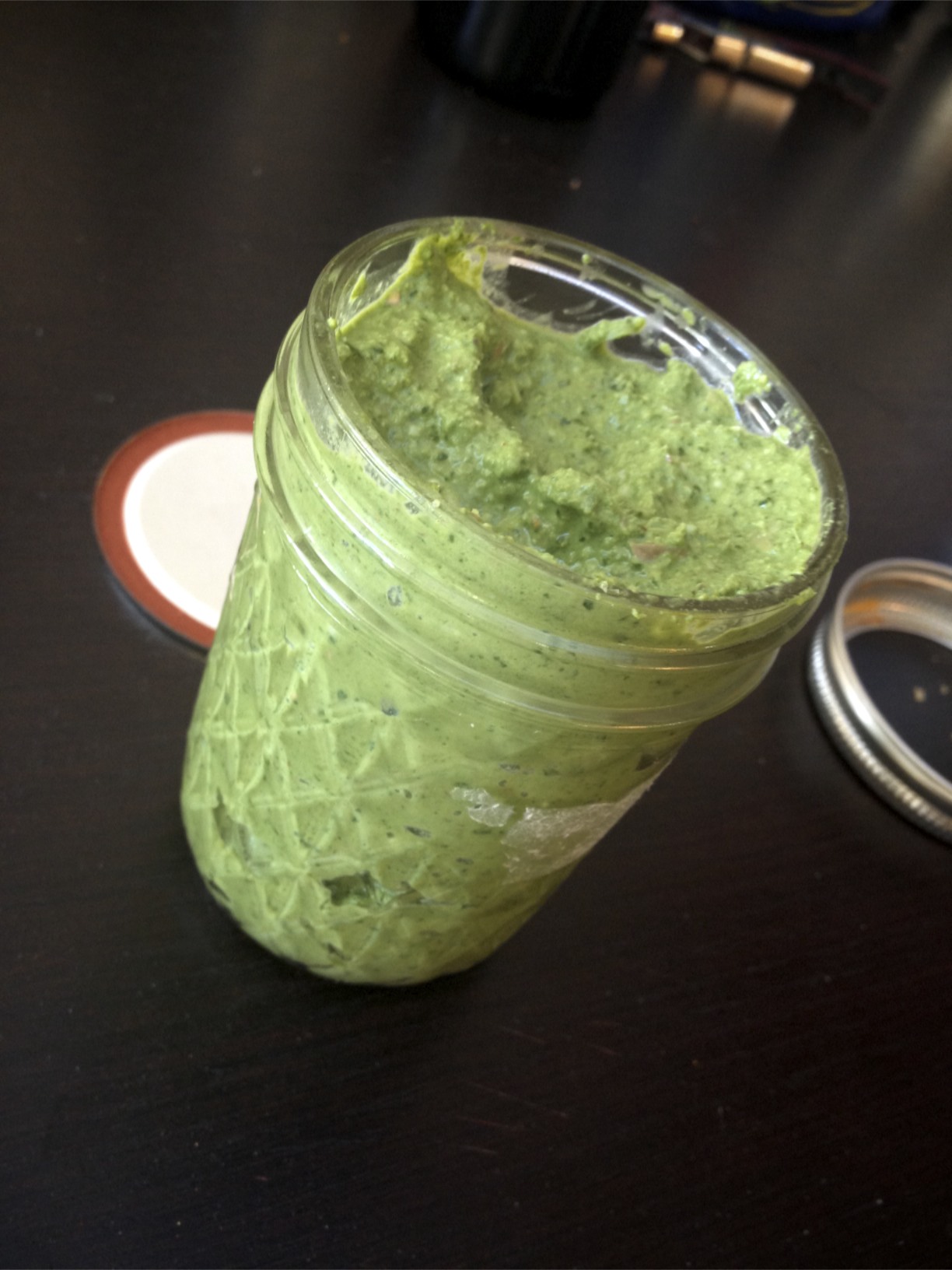 I made a big batch of sorrel pesto about two months ago and kept it in the freezer (removing small lbatches into jars that lved in the fridge about twice a week or so). I found a huge (HUGE!) box of what I thought was spinach for just ten shekels at Machane Yehuda, so I took it home. Turns out it was sorrel! Instead of hitting my books, I went straight to the kitchen to prepare a big tub of pesto. In additoin to my master blini plan, this pesto is the perfect quick fix to add zest and rich flavor to simple salad of chopped veggies. Really, it’s a game-changer… especially when in a time and resource crunch (story of my life).