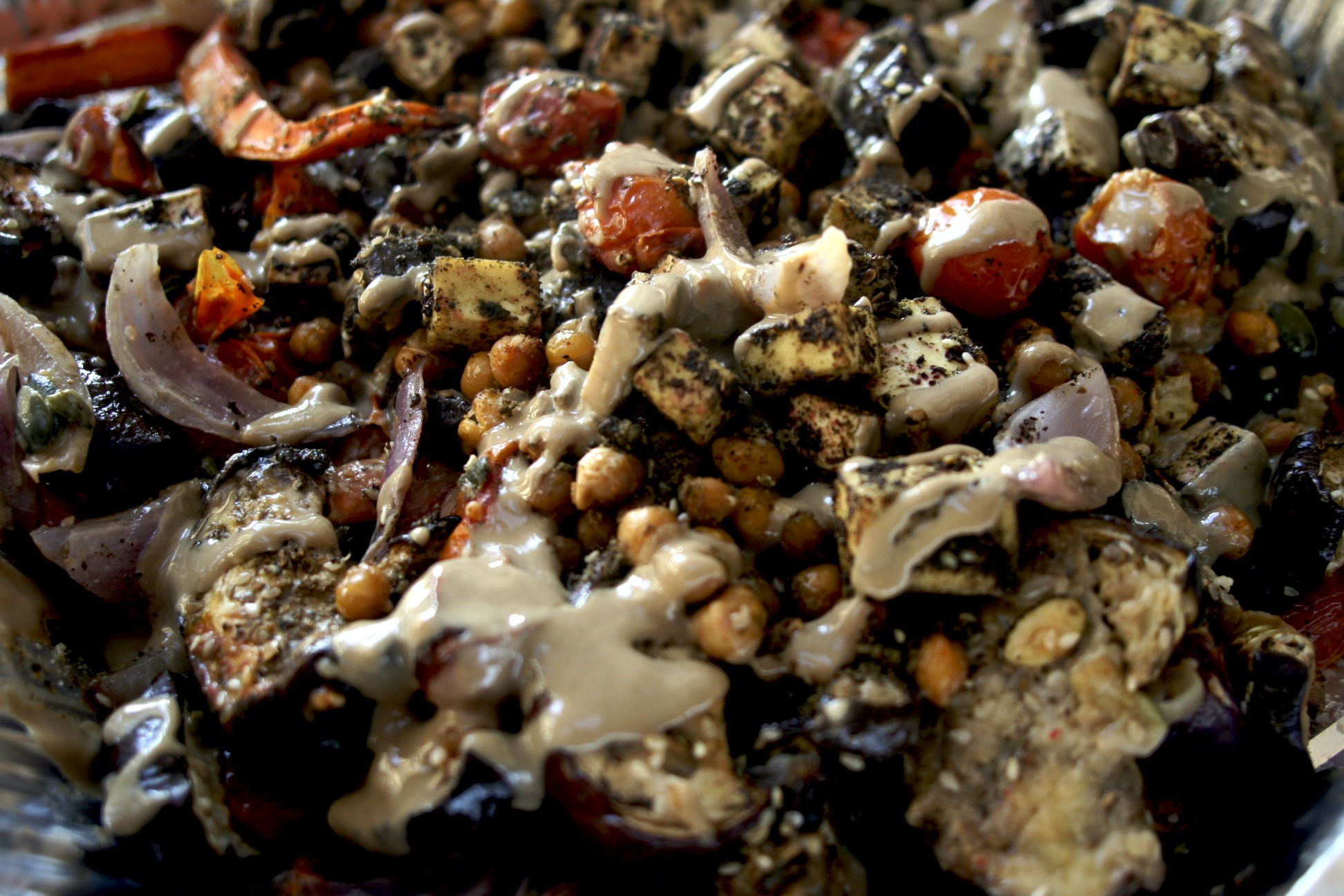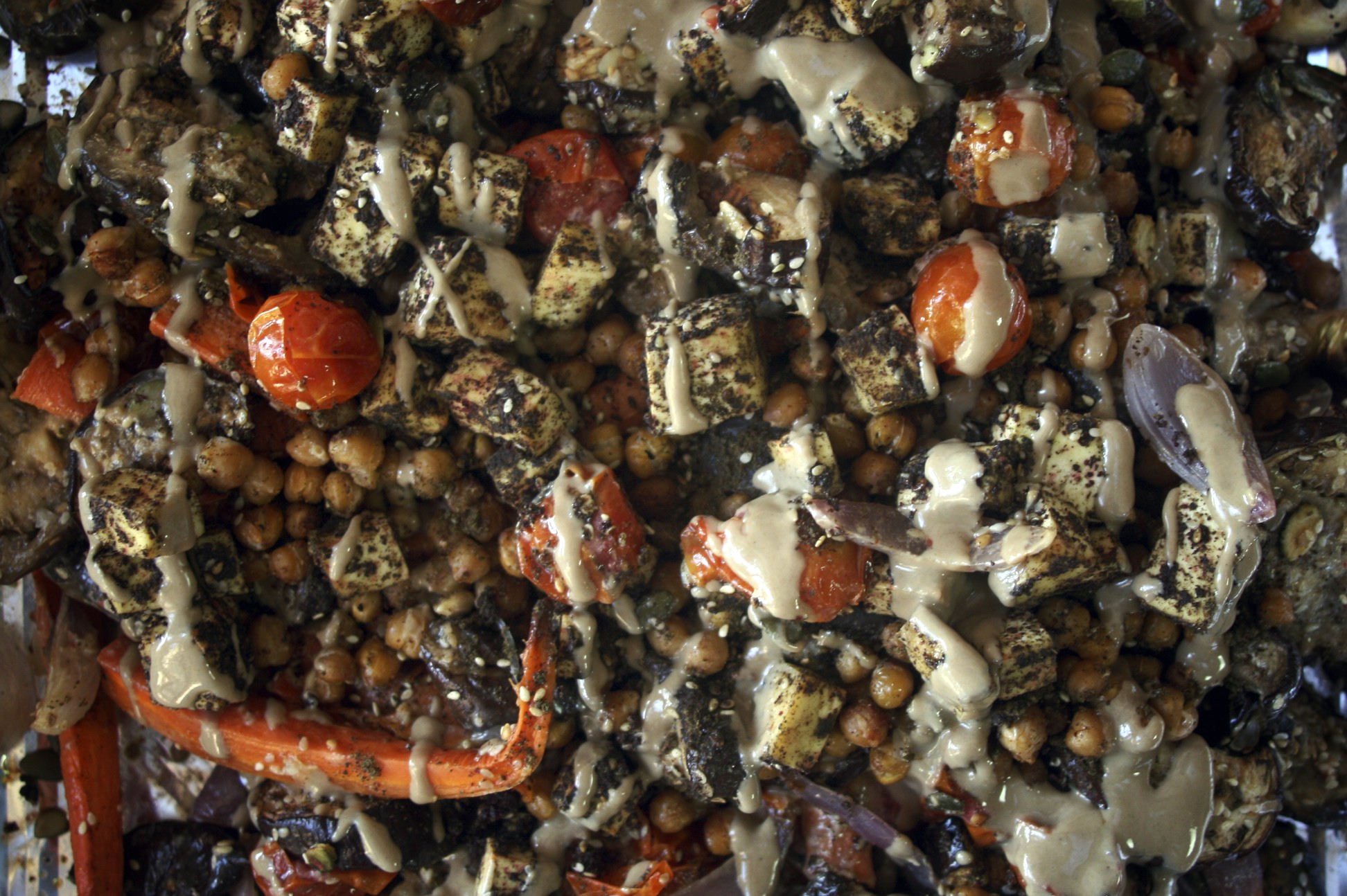 Remove the tofu from its packaging and pat dry with paper towels. Cut tofu into cubes and allow excess liquid to drain. While draining, prepare mixture of olive oil, zatar, sumac and salt. Mix tofu cubes with the zatar mixture so that each cube of tofu is covered with a green powder coating. Lay flat on baking sheet covered in parchment paper.