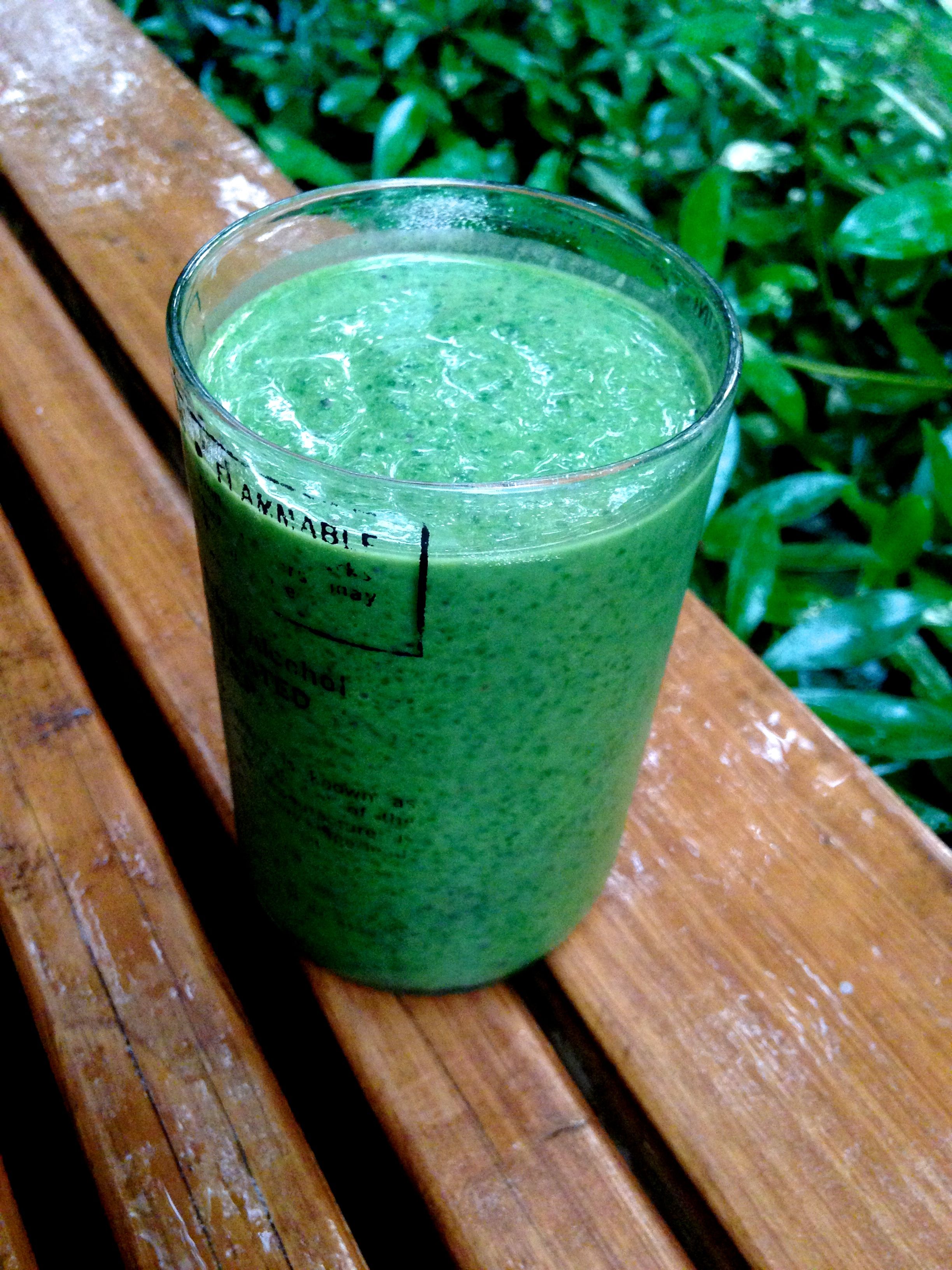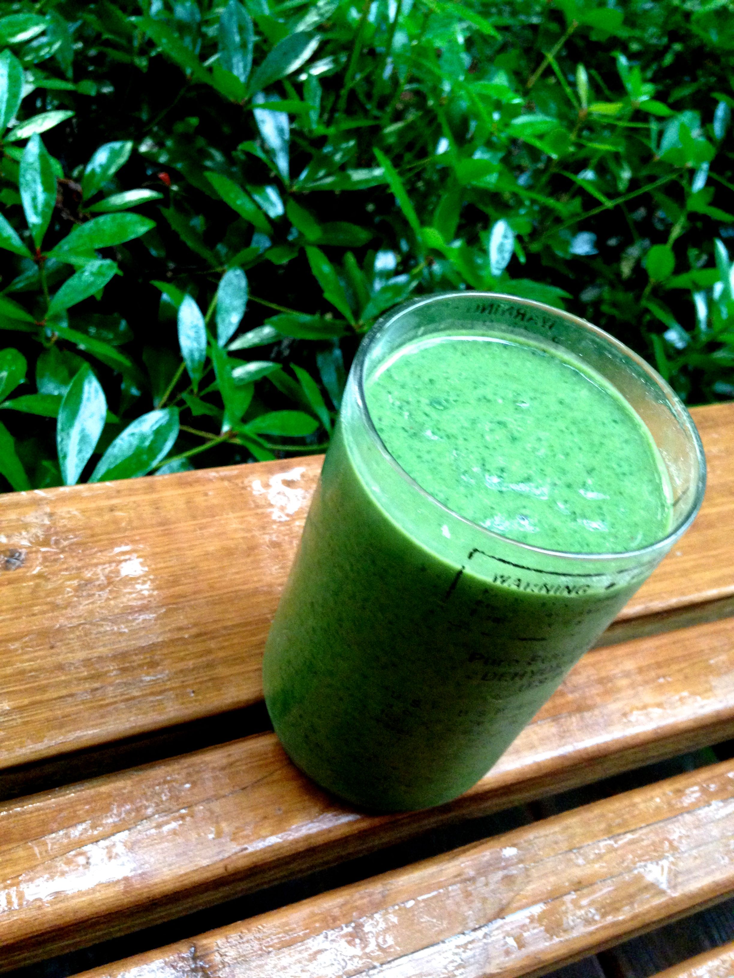 Place all ingredients into food processor in order listed (always put liquid in first to give the blades some room to work their magic). Blend until smooth. Add ice if you desire a thicker consistency.